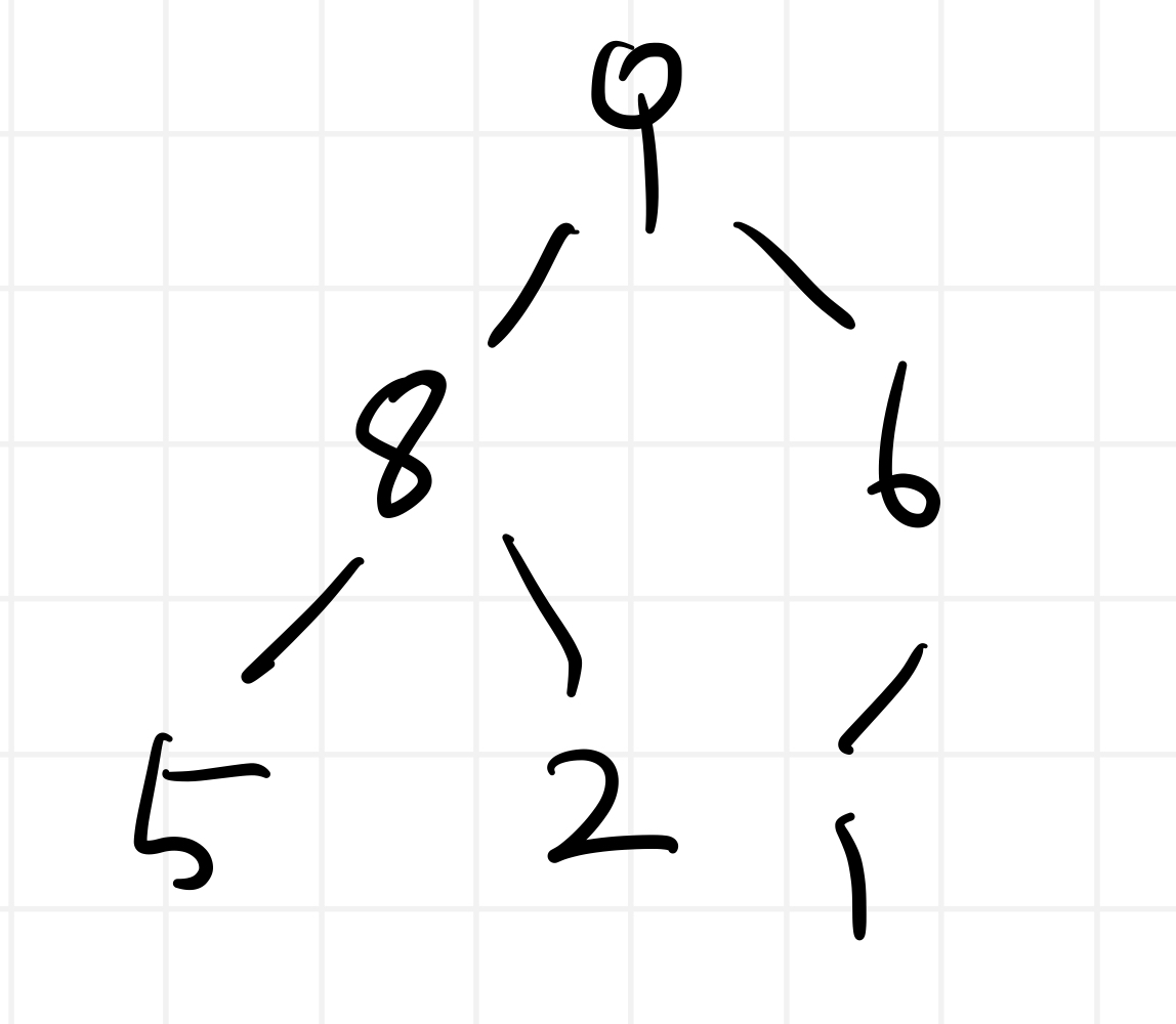 위와 같은 그래프가 있다고 할때, 깊이 우선 탐색으로 탐색해보자. 루트에서 왼쪽으로 계속 이동하며 리프 노드가 나올 때까지 가므로 처음엔 9 > 8 > 5 순으로 이동할 것이다. 리프 노드에 도달했으므로 부모 노드로 돌아가서 오른쪽 자식을 다시 탐방한다(부모 노드로 돌아가는 것은 순서에 넣지 않는다). 따라서 9 > 8 > 5 > 2 로 이동할 것이다. 마찬가지로 리프 노드이므로 부모 노드로 돌아가고, 모든 자식을 방문했으므로 다시 위로 올라간다. 이후 6 > 1 순으로 탐방한다. 따라서 최종 순서는 9 > 8 > 5 > 2 > 6 > 1이 될 것이다.