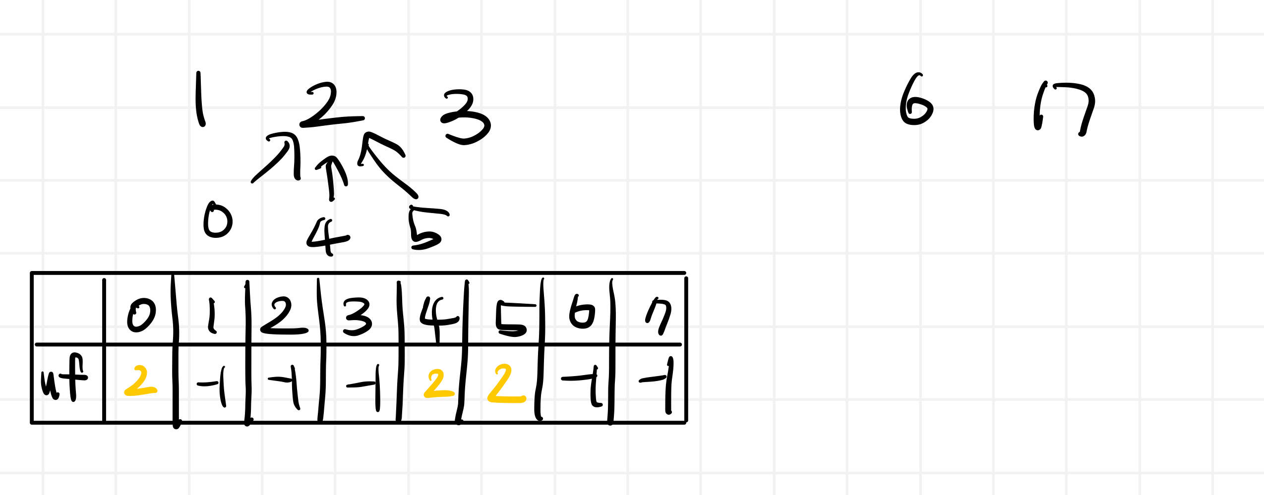 그렇게 되면 2는 0의 부모, 5는 4의 부모가 된다. 이 때 find(0) 연산을 수행하면 2를 반호나할 것이고, find(5) 연산을 수행하면 4를 반환할 것이다. 이로써 각각이 같은 집합에 있다는 걸 알 수 있다.