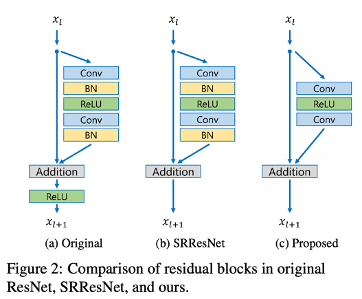 EDSR은 기존의 SRResNet의 block structure에서 batch normalization을 제거한 block structure을 제안하였다.